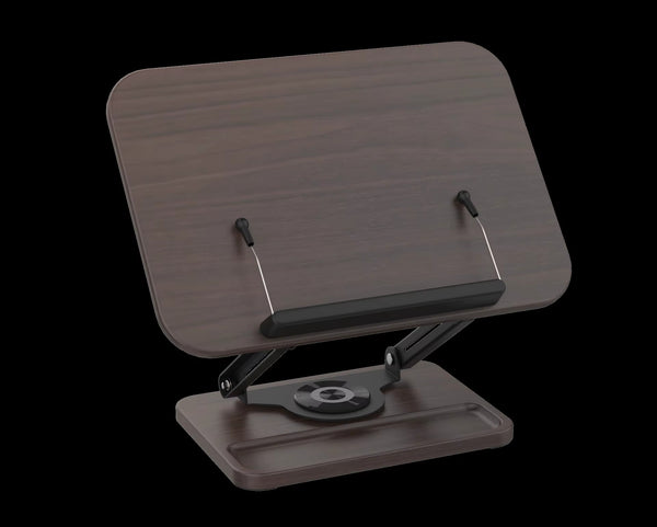 - هذا الحامل للقراءة مصنوع من خشب الجوز الطبيعي مع هيكل معدني، ويتميّز بإمكانية تعديل ارتفاعه وتصميمه القابل للطي لتوفير المساحة.